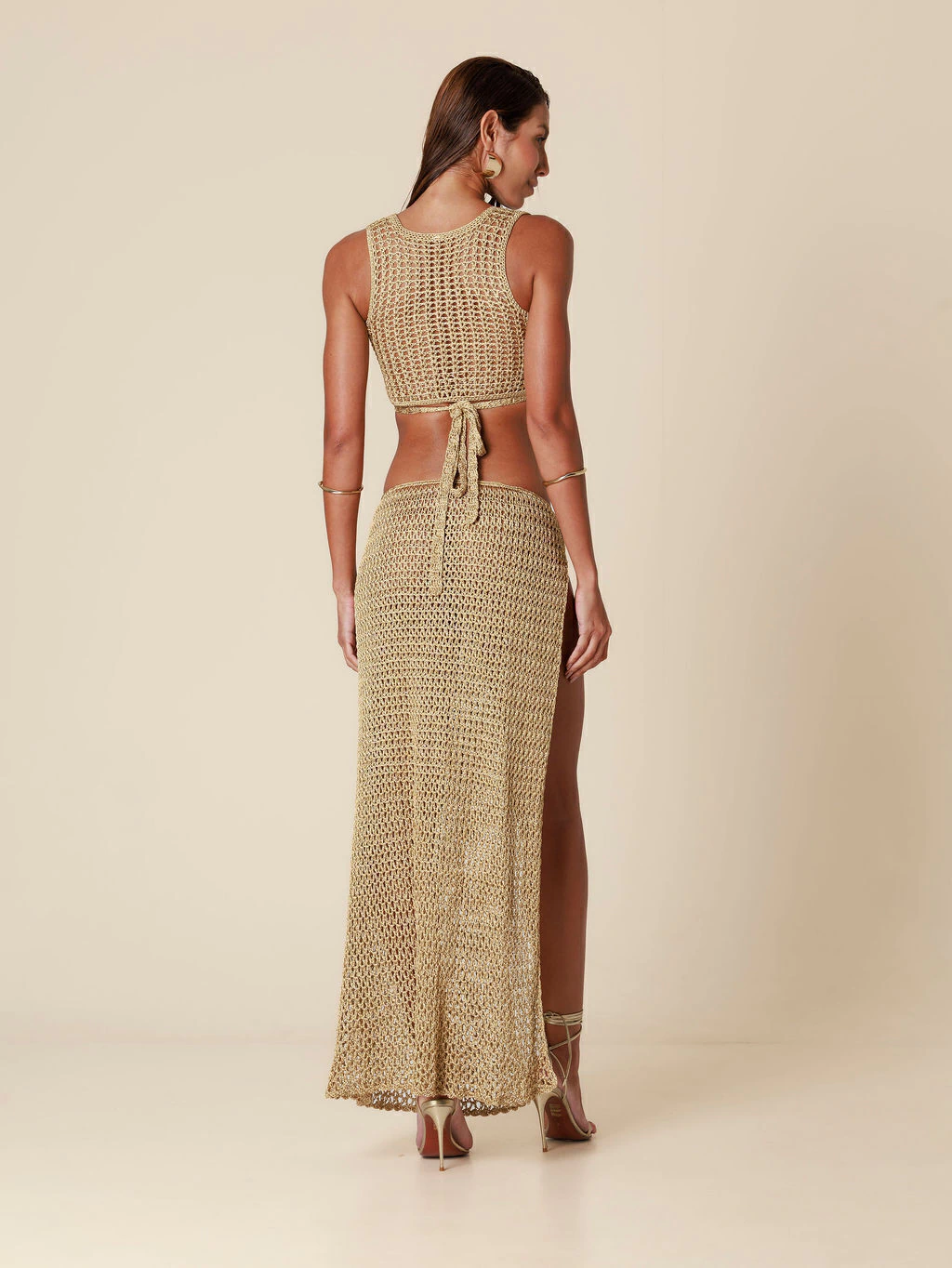 Saia Longa crochet em linha de seda, fendão lateral, medalhao dourado, elastico na cintura